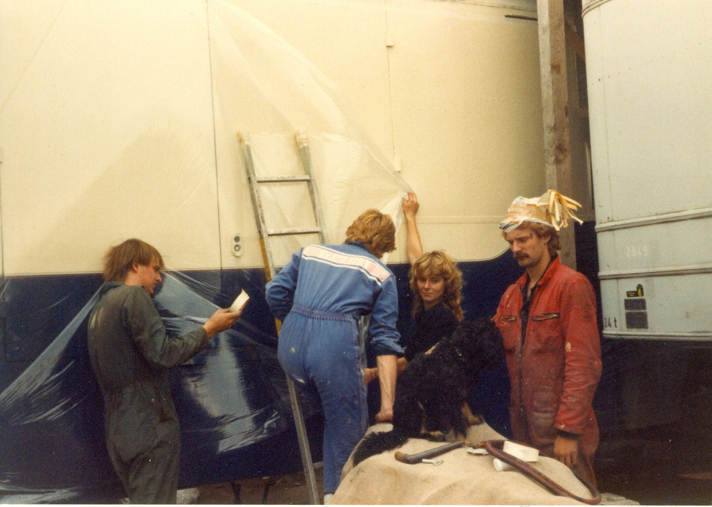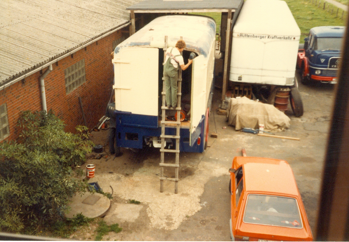 Man nennt es gern „fahrgeil“. Die hässliche Farbgebung musste natürlich erstmal neutralisiert werden. Blau und Rot – die Hausfarben – lassen schon mal die Verbundenheit mit der neuen Heimat durchblicken. Wann immer es der Tag zuließ, waren wir unterwegs, um dem Zweitakter das Laufen wieder beizubringen. Welch herrliches Fahren und dann der unvergleichliche Sound des kraftvollen Motors, das Brummen des Roots-Gebläses, das Schnarren der Kupplung – auch Könige können nicht schöner reisen. Wir fahren durch das kleine Örtchen Barmstedt. Der Zweitakter röhrt durch die Gassen und dadurch aufgeschreckt wirft kurz vor uns ein junger Mann sein Fahrrad zu Boden, reißt die Kamera hoch und erwischt uns im letzten Moment. Die erste Begegnung mit unserem langjährigen Hausfotografen „Mauschelöl“ Michael Horstmann selig. Aber ein solch herrliches Fahrzeug braucht auch unbedingt ein passendes Kleid. Also wird alles mobilisiert, was sich an Helfern anbietet und in einem Gewaltmarsch wird er Wagen im Frühjahr 85 neu aufgemöbelt. Die Trapezbleche am den Seiten und am Heck verschwinden und die dahinter krumm und schief gefahrenen Karosseriepartien werden wieder geglättet bzw. neu verblecht. Ebenso ergeht es den Kotflügeln, den Türen und der Nase. Und so rollen wir bereits frisch in Schale 1985 zu unserem ersten Oldtimer-Treffen zu den Heckers nach Warstein. Im weiteren Verlauf wird der Wagen aufgerüstet. Es folgt die Beschriftung der Türen, wie es in den 30er Jahren vorgeschrieben war, die Stirn wird mit Anhängerdreieck und Flügelrad dekoriert, die Stoßstange erhält eine zeittypische Bemalung, ein Fernverkehrsschild mit der roten Konzession wird montiert. Alles Attribute denen bisher noch niemand Aufmerksamkeit geschenkt hatte, die aber einen Fernlaster erst ausmachen. Und wir kommen ja schließlich aus dem Fernverkehr.